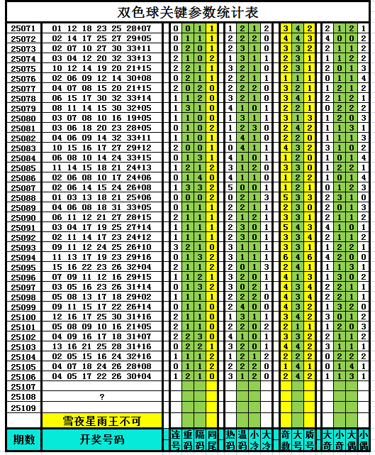 以下是作者手工统计的双色球关键参数统计表,对喜欢参数分析、过滤缩水、选号胆杀的技术性双色球爱好者有所帮助,其它读者可略过不看。