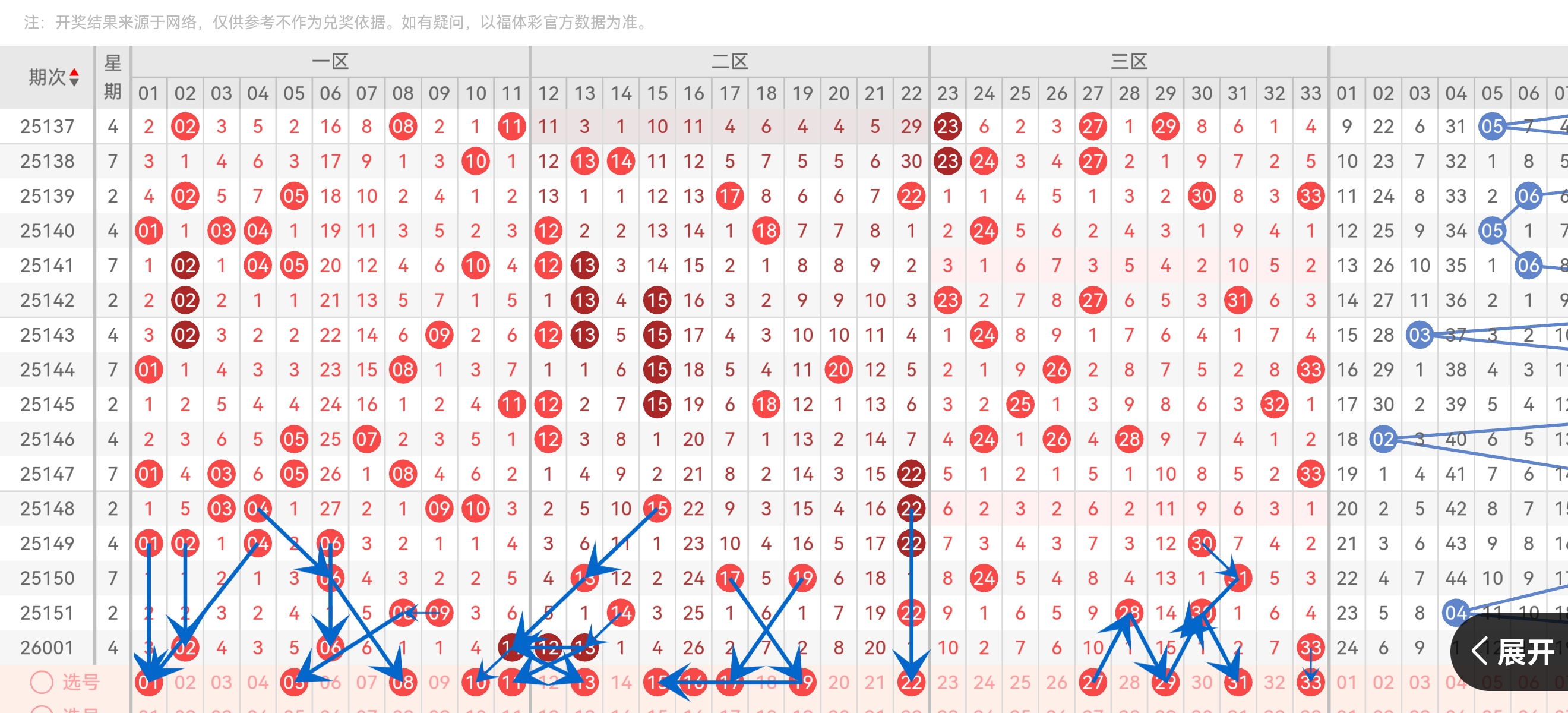 三区(23-33)连续10期未断档,33 两次重复。