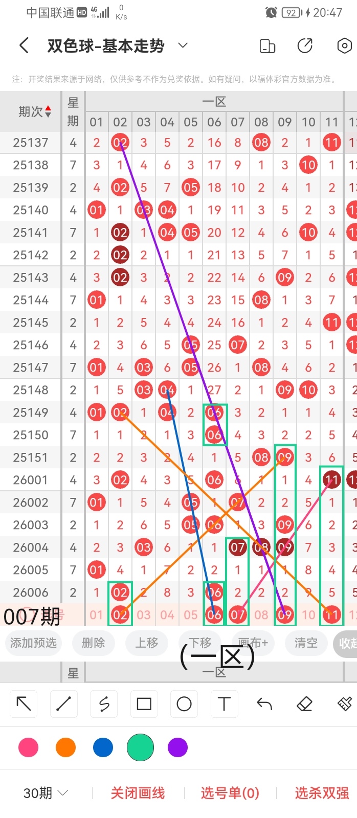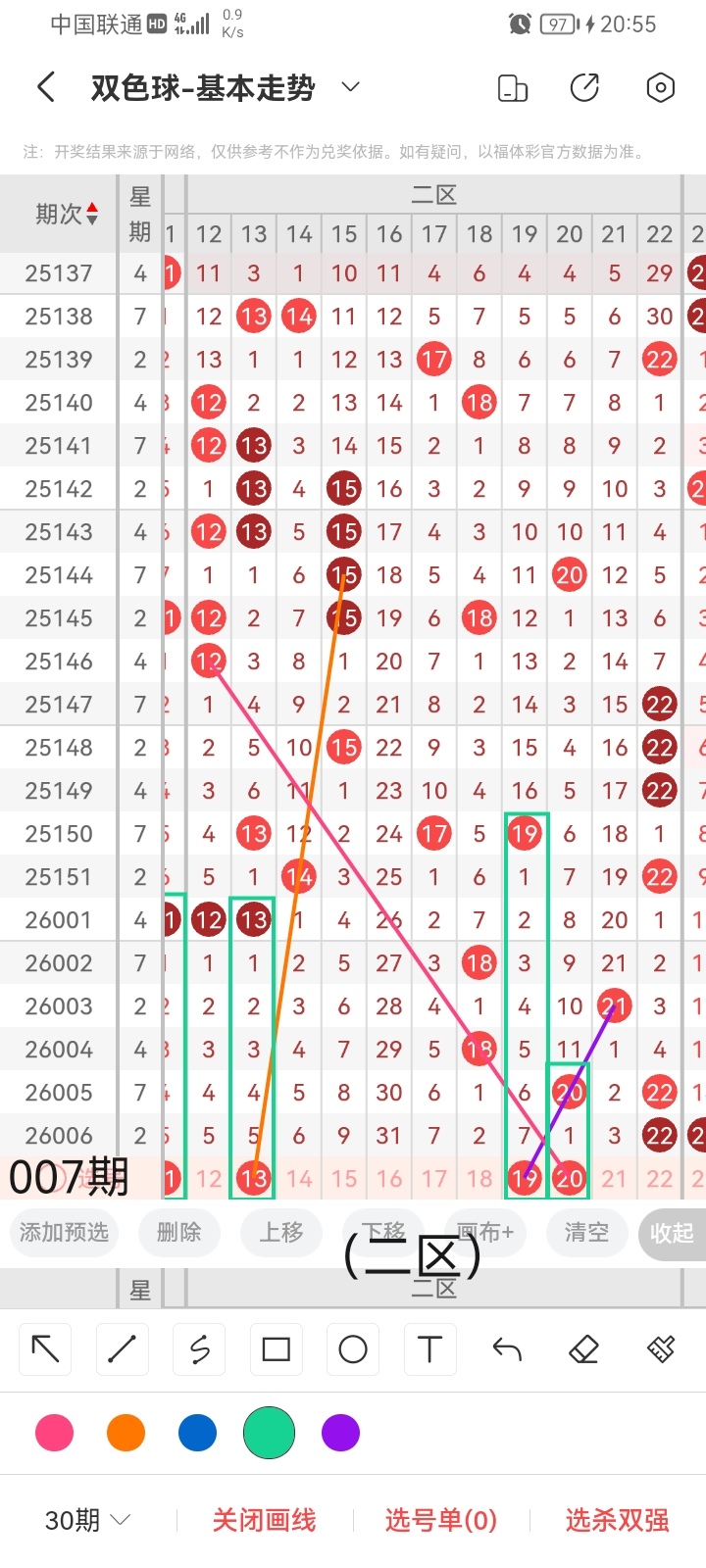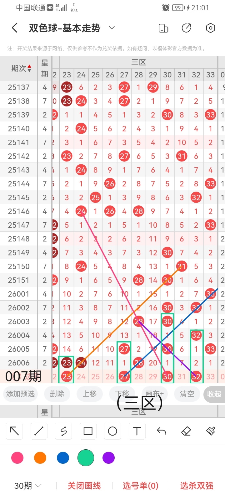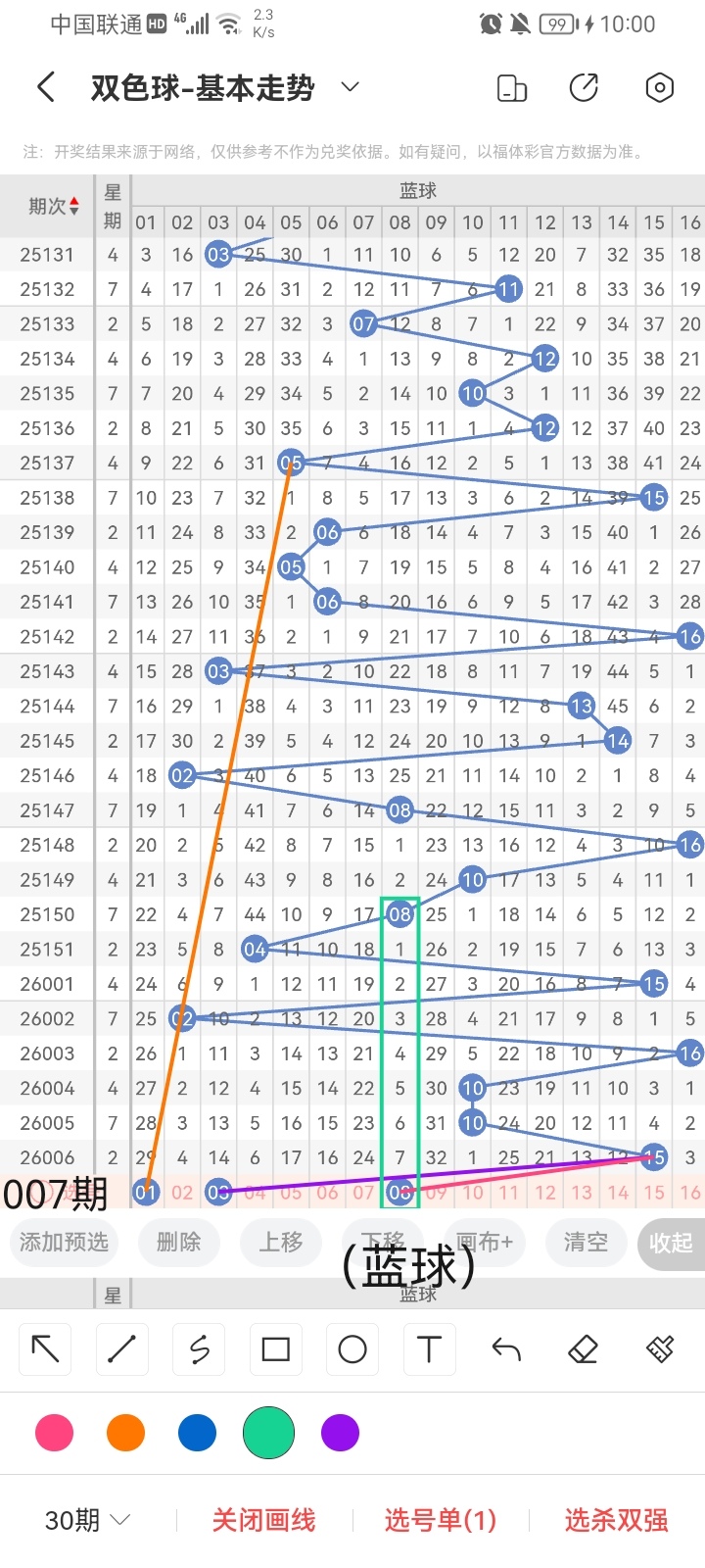 小梁结合上面图中画线思路的论证,最后给大家汇总提供一下本期红球、蓝球数据,供大家参考: