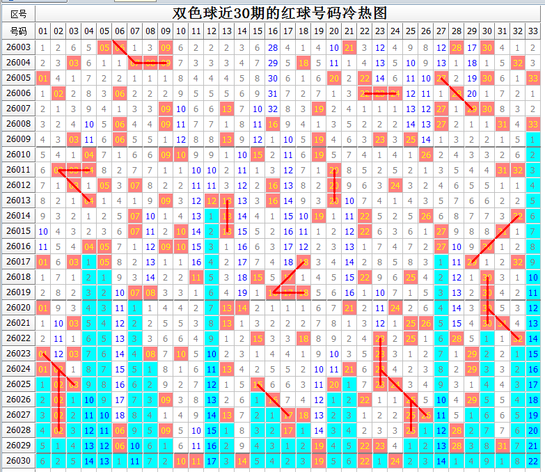 双色球26031期冷热号码及出号趋势分析(具体号码可参见上图或会员文章的觅宝图):