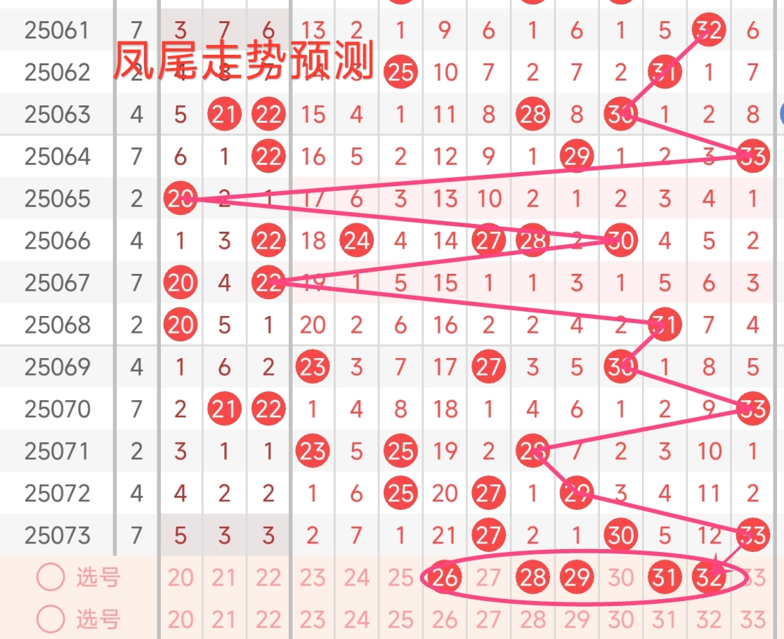 红球三区推荐(23~33): 上期开出3枚号码,号码为27、30、33,本期红三区建议出号1-2枚,本期红三区建议出关注号码26、28、29、31、32。