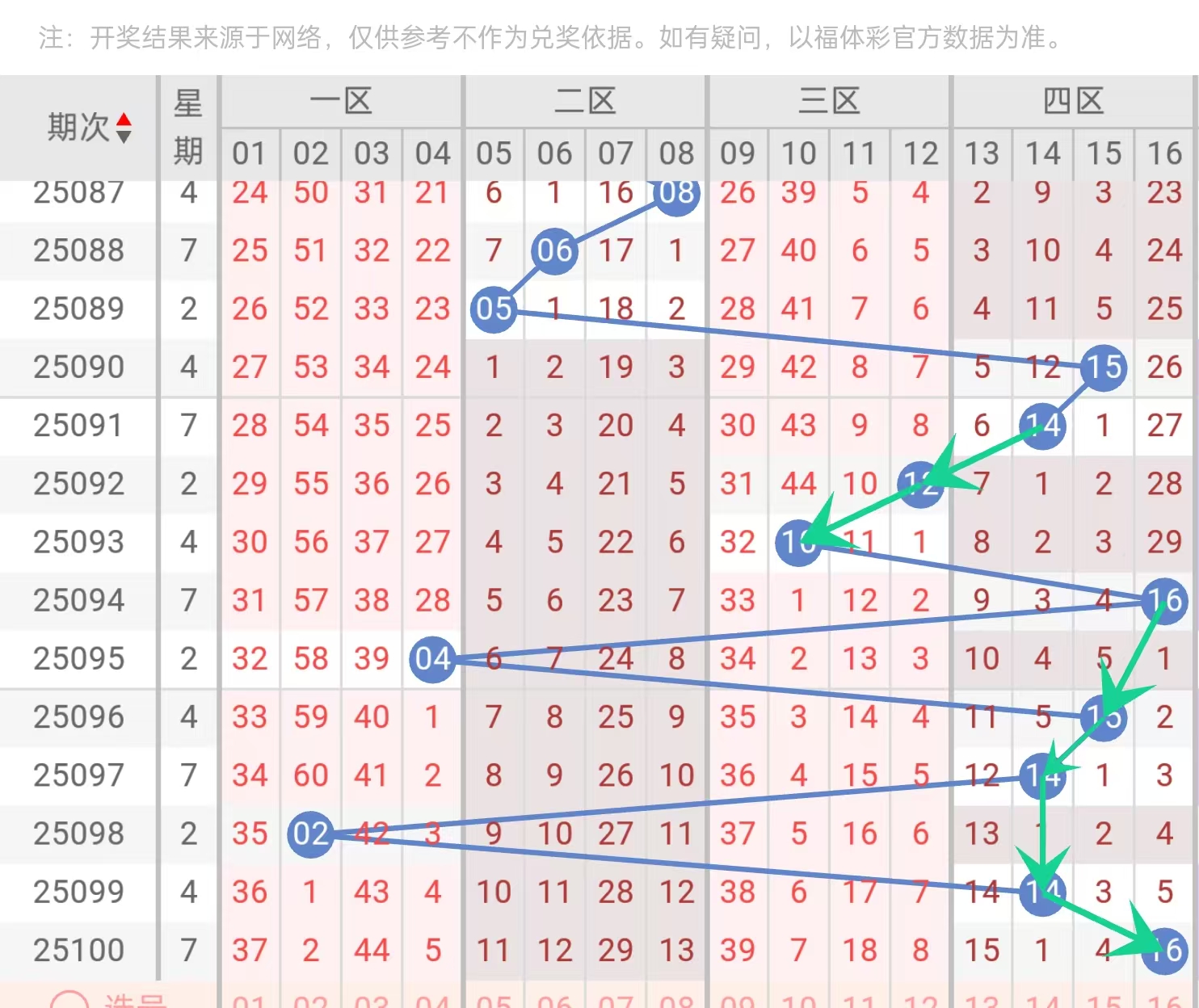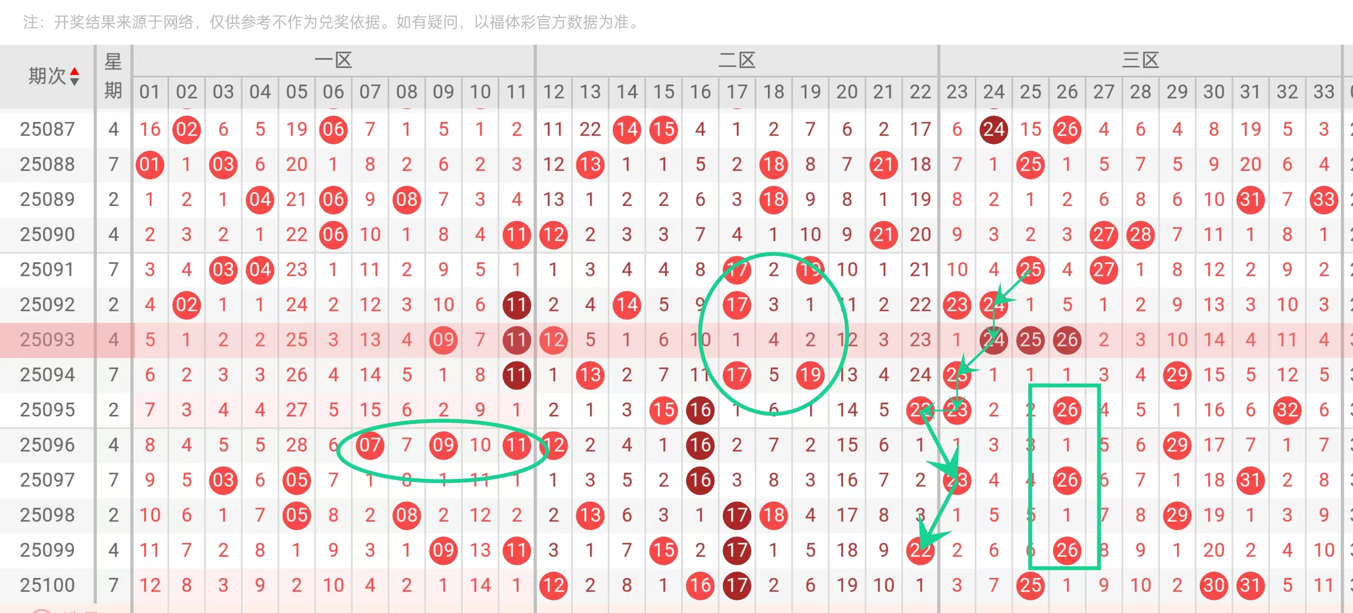将33个红球分为三个区间(1-11、12-22、23-33),可发现各区间的出号频率存在差异。中间区间(12-22)往往出号较多,两端区间则相对较少。此外,连号(如12、13、14)和间隔号的出现也值得注意,连号现象在历史数据中并不少见。