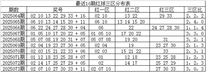 一区上期走热,开出3个红球,近10期开出20个红球,走势与理论相当,本期看好转热,开出3个号码,参考号码06、10、11;二区上期走冷断区,近10期共开出20个红球,出号比例与理论持平,本期预计继续走温,出现1-2个红球,注意号码16、21;三区上期表现较热,出现3个奖号,近10期共开出20个红球,出号与理论个数持平,本期预计继续走温,出现1-2个红球,看好号码25;