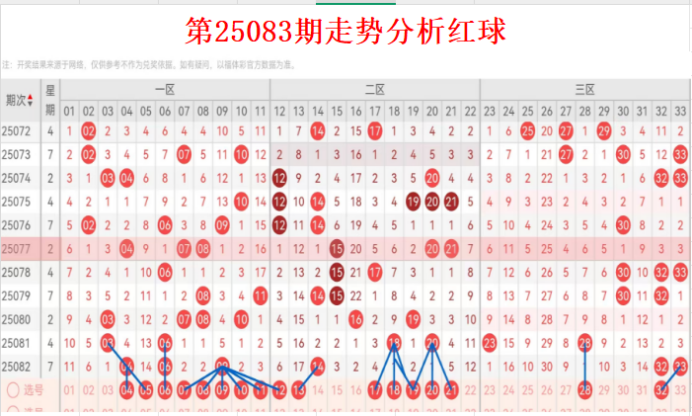 双色球第25083期走势分析,上期大底命中四码,内含红、蓝球大底