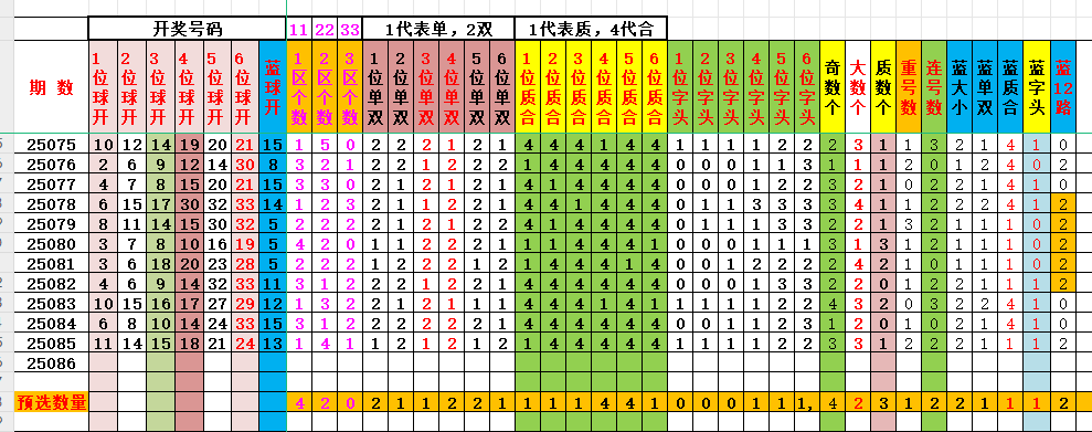 2、号码属性:红球17~33号为大,1~16号为小;1、2、3、5、7、11、13、17、19、23、29、31号共12个为质数号码(1号归入质数),其它21个号码为合数号码;