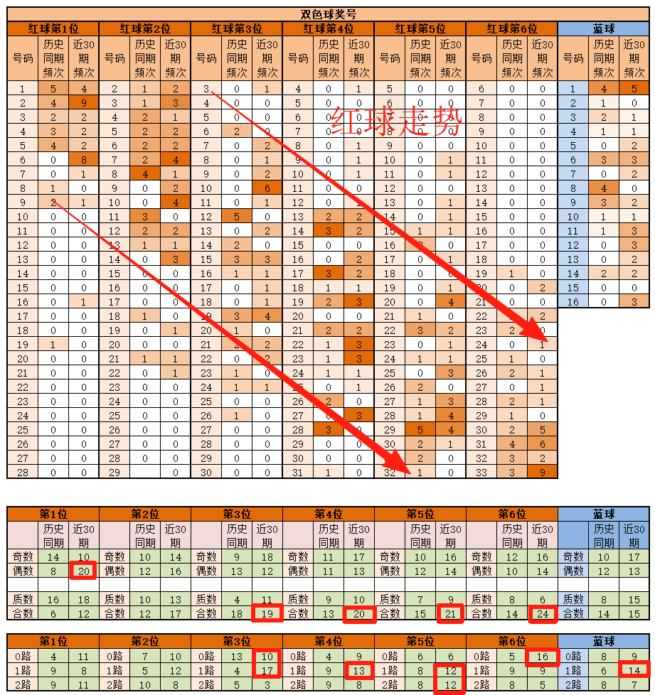 第2位,基本在3-14之间,历史同期频次最多的为8近30期,频次最多的为7-10,合数01路略微优势;推荐重点3、7、10、14。