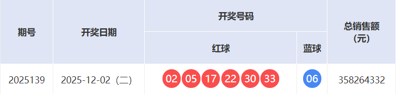 上期开奖号码:02 05 17 22 30 33 + 06。