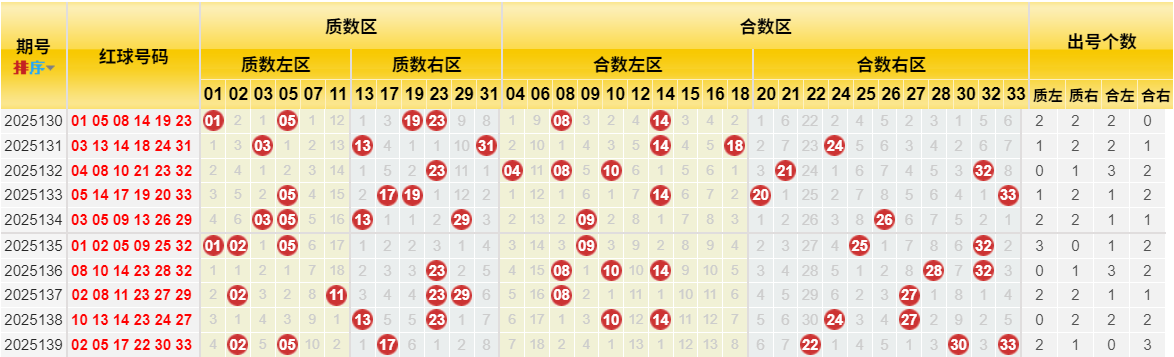 上期红球质合比为3:3,达到完美平衡。然而,近15期整体合数(51次)仍明显多于质数(39次)。在短暂平衡后,本期合数可能重新占据优势,预测质合比 2:4。