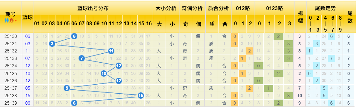 近5期蓝球号码为10 -> 12 -> 05 -> 15 -> 06,在05-15区间宽幅震荡。上期开出中号06,结合对1路冷号的关注,本期应重点搜寻01-10区间内的1路号码,如01、04、07、10。
