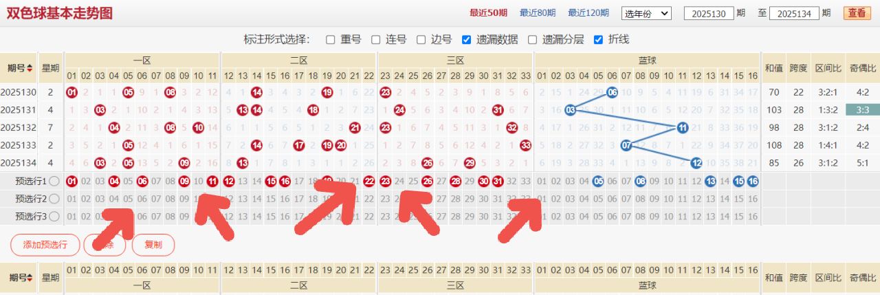上期双色球的开奖号码为:03 05 09 13 26 29+12,和值为85,跨度为26,区间比例为3:1:2,奇数偶数比例为5:1,012路比例为2:1:3。上期号码的热度聚焦量基本上在一区。近两期的热度整体变化是由二区转向为一区。那么我们会发现近期一区和二区的整体热度变化是呈正好相反的形式。都是由热到冷,或者是由冷到热。那么预示着本期的热度变化,波动性依旧会比较大。看好本期的综合热度,会体现在本期中右侧号码区域。这是本期号码的初始基本思路。
