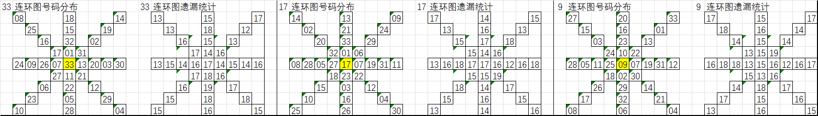 由于数据量大,不一一统计,下图为各个号码分别在33、17、9连环图上的遗漏统计汇总图: