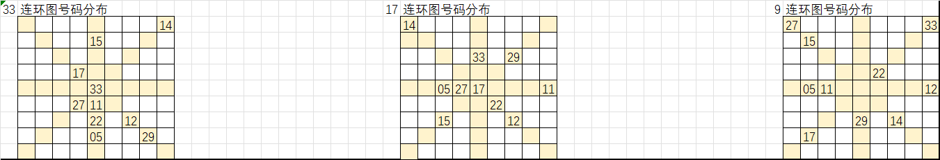 我的思路主要是统计分析九转连环图,彩虹官方平台上也有分布图,我们先来看看原理。九转连环图是宋代数学家杨辉的“幻圆”演变而来的,每个圆环、每条轴(不含中心数字)的和值均相等。经过各位前辈老师不断改进应用,形成了以中心数字为33、17、9的连环图,保持每个圆环、每条轴等和值的特点,这里要感恩古代文化的博太精深,也要感谢各位前辈推演应用的方法。