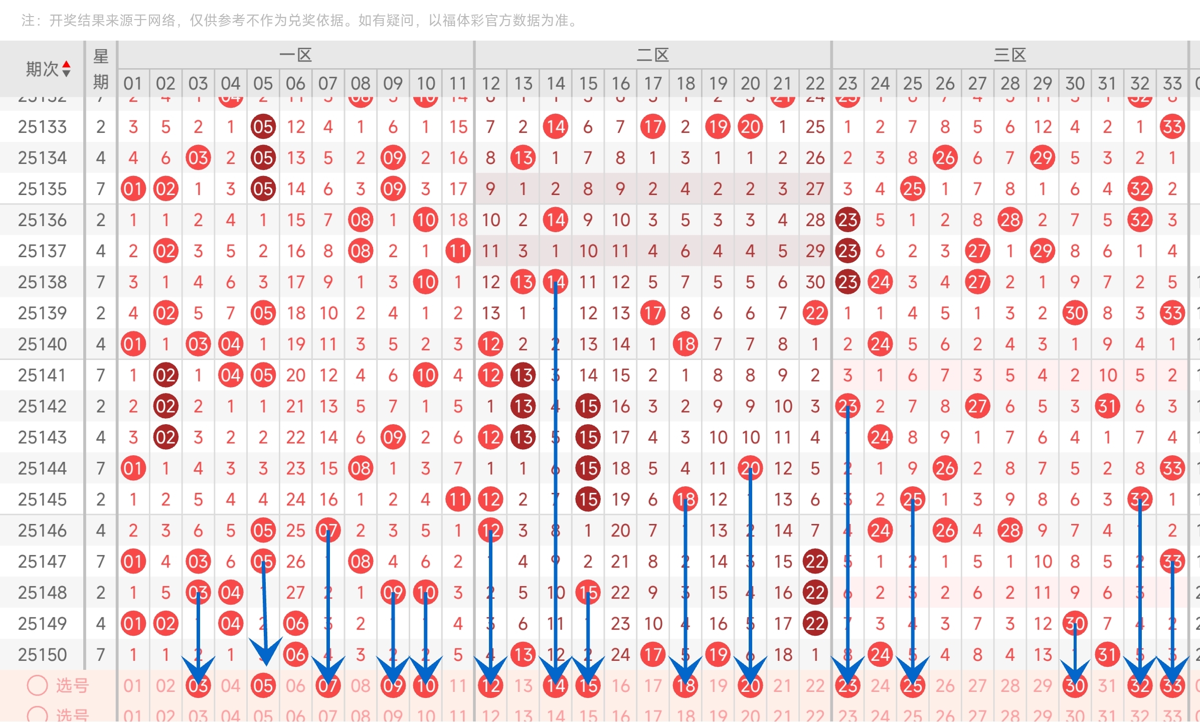 上一期三区开出了2431号球。往前一期开了30号球。通过走势图分析,可以看到上期最近两期凤尾都开了右边的号码,本期有可能继续开右边的号码。其次就是左边的号码也可能开出,关注一下左边的号码。最后再结合冷热号和遗漏期数,本期我们可以关注2325303233等号。综上所述本期我们推测有可能开出2325303233等号码。