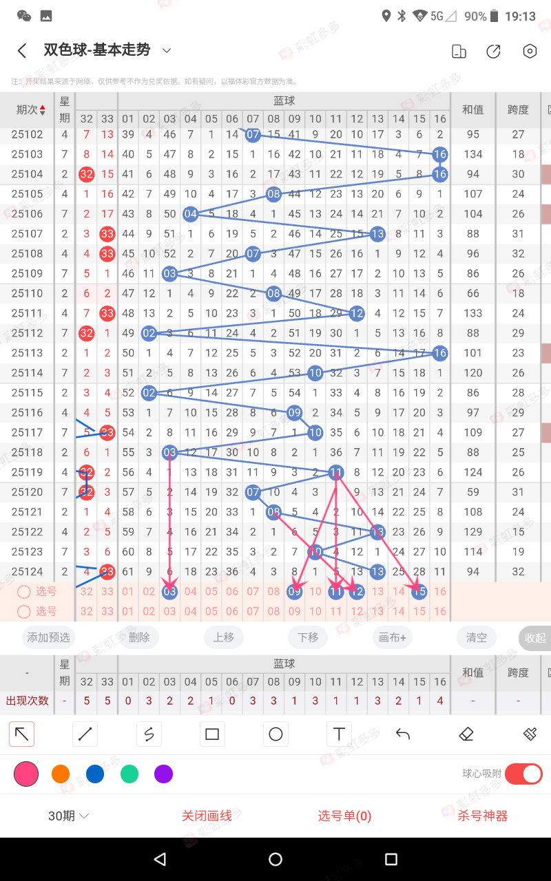 比如,124期蓝13号,123期蓝10号(属1路)那我们这期要杀的蓝号就是13+1=14大16减16,14为本期杀号,008期错,039期-040期,060,074-075期100错,防三连错