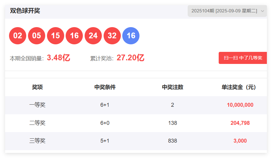 大家好啊,我是算王,一个热爱彩票的作者。今天和大家一起聊一下双色球第105期,那么首先我们看一下104期双色球一等奖共开出两注,单注奖金1000万。二等奖开出138注,单注奖金20.4万。接下来,我们一起来分析一下105期的各个分区重点号码。