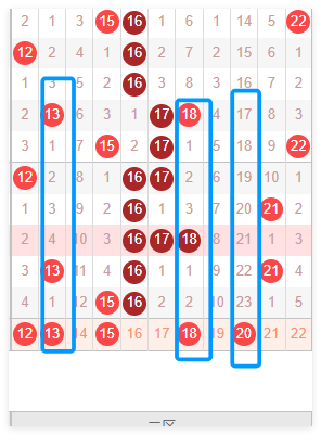 接着呢,我们来看一下双色球二分区。也就是12~22这个区间的号码,上一期开出了一对连号15和16号,那么本期的话,二分区域我们考虑号码可能只有一到2个。大概率是一个号码,那么主要的话,我们是要考虑隔期号13以及18和20这几枚号码,重号关注15号。