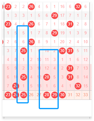 最后呢,我们分析一下三分区23~33这个区间的号码。上一期开了两个偶数24和32。那么本期的话,我们重点关注一个非常关键的号码24号。那么24号这个地方呢,很容易形成三连号232425。其次我们要关注一下尾号2829。那么本期的话,凤尾我们还是要关注28.29作为一个结尾。