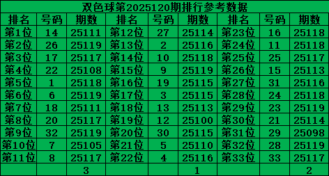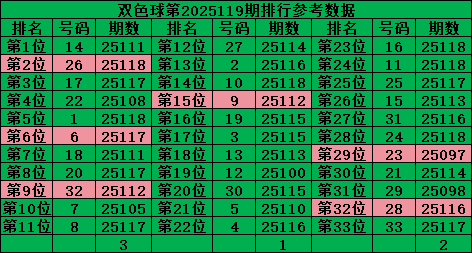 以双色球自开奖以来每个号码出现的次数排位,可分为冷热温三区,2025119期三区开出比例:3:1:2