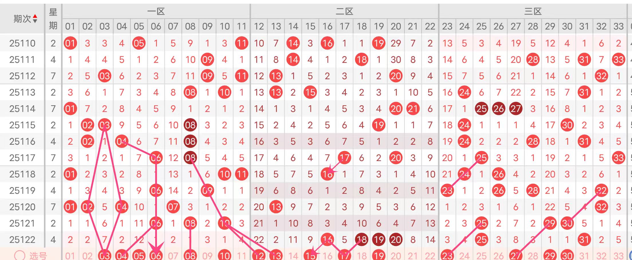 红球三区比:本期红球三区比为 0:4:2,近五期红球区间比分别为 3:2:1 ,2:0:4 ,4:1:1 ,3:0:3 ,0:4:2 本期预计红球三区比为 1:3:2。