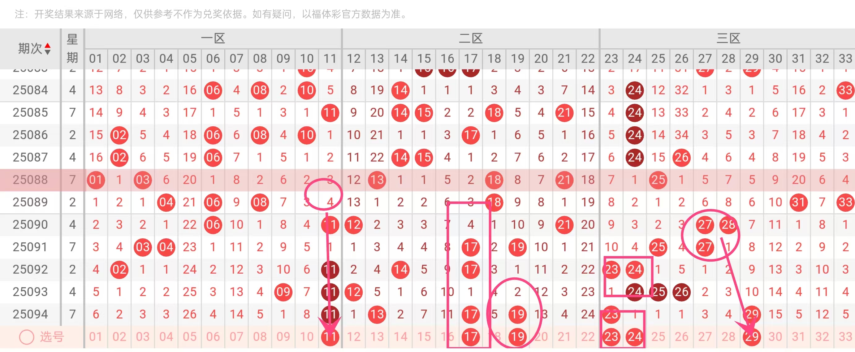 杀号依据:基于冷热号阈值模型(冷号:遗漏≥10期;热号:近10期≥3次),结合区间均衡性(一区01-11、二区12-22、三区23-33)排除弱势区间号。
