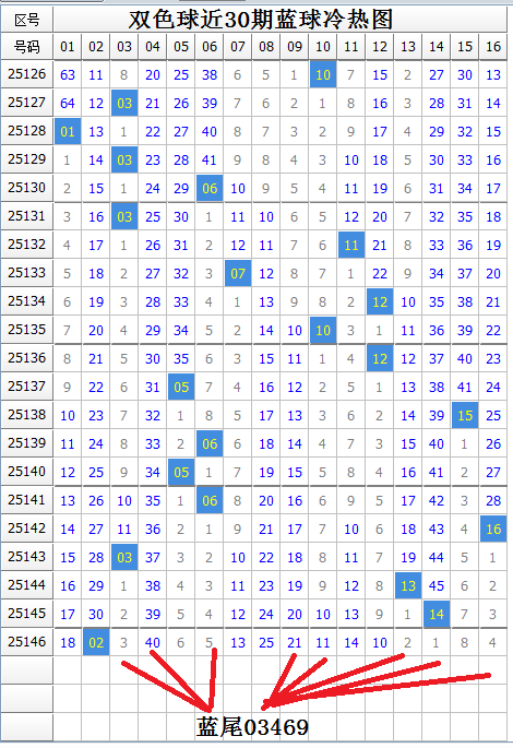 蓝球本期有热蓝8枚,冷蓝8枚,蓝球冷码数量一样。上期开出冷蓝,这是连续5期开出,由于近期蓝球冷热交替开出规律不明显,本期蓝球冷热难定。