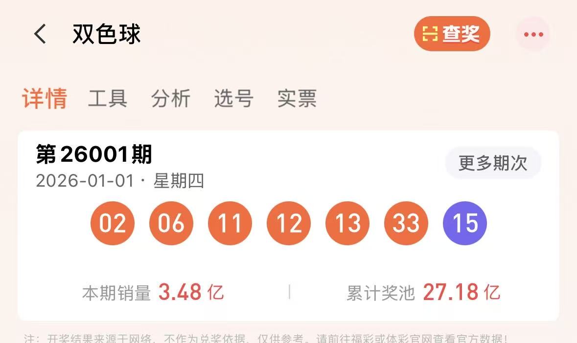 上期双色球开奖结果为 02.06.11.12.13.33+15