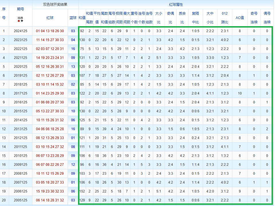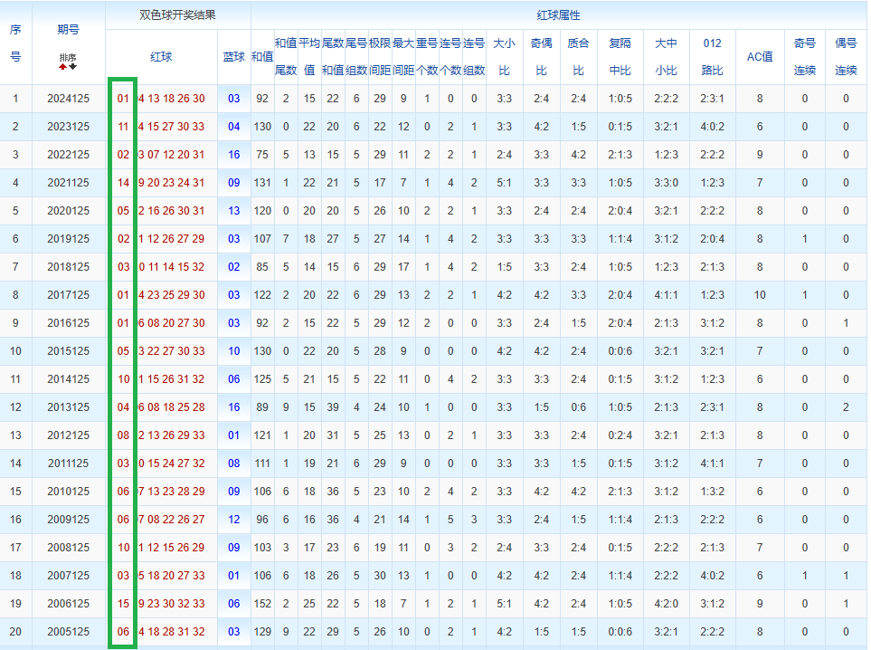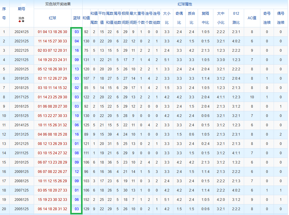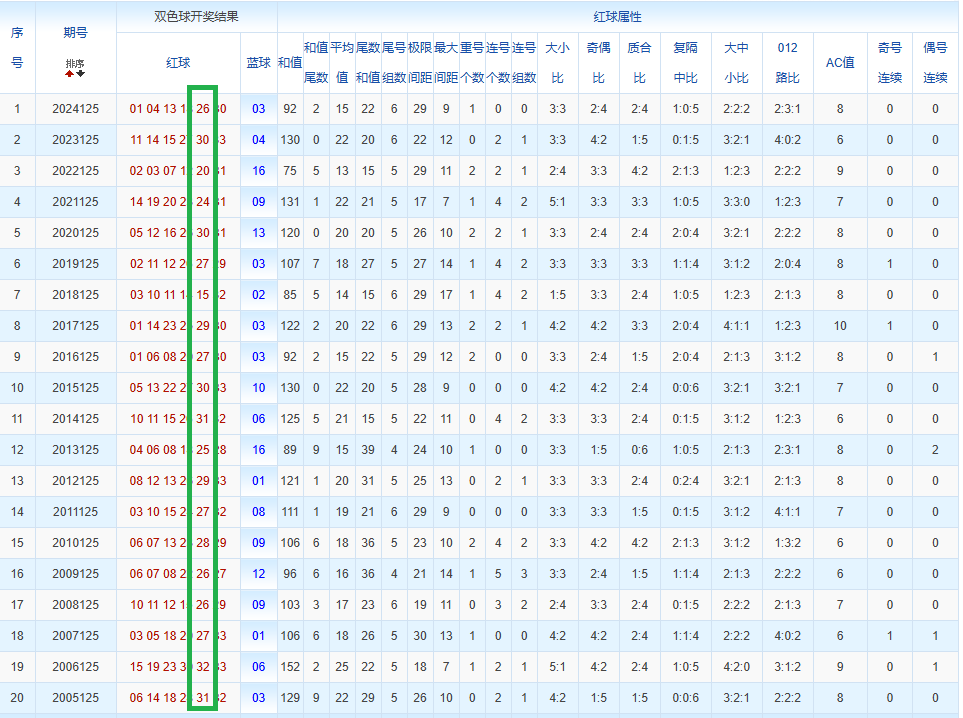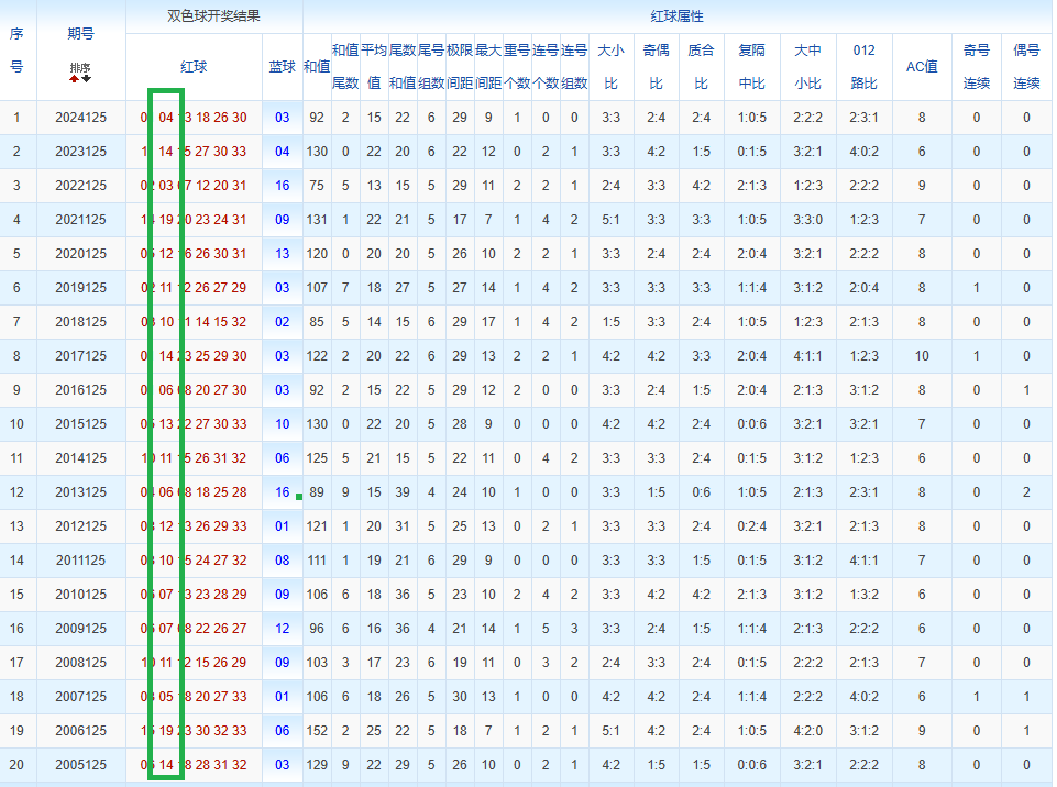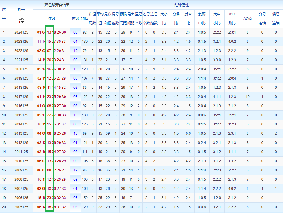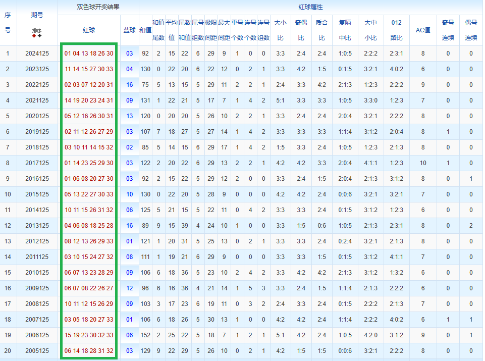 通过观察,我发现双色球往年同期的开奖数据与本期号码之间存在显著关联。具体来说,在红球中,从第一位至第六位,通常会有约4个位置上的数字与往年同期相同位置的号码一致;而蓝球号码中,也有多期开奖结果直接包含了往年同期的数字。因此,我们可以借助往年同期各位置上的号码,作为分析本期开奖情况的重要依据。在此基础上,还可结合往年同期的其他相关条件,进行综合性的号码组合推荐。