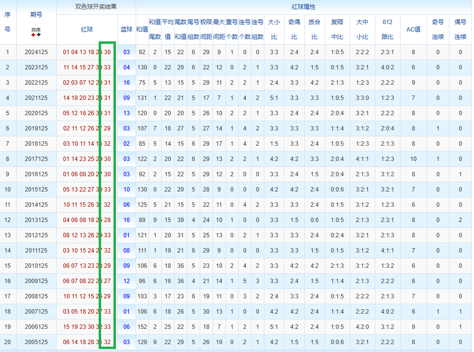 往年同期中选取出现次数靠前的数作为我们的分析对象,其数据有:30 27 26 15 33 32等
