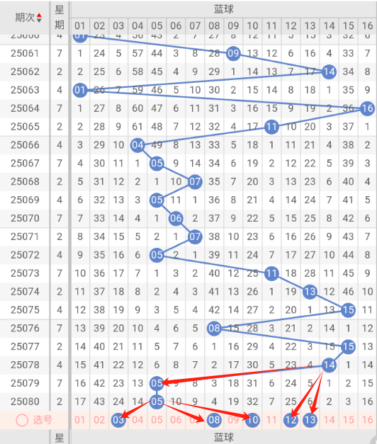 根据走势图近10期的走势看,蓝球在065期开出11蓝球之后,7小3大1小2大2小,再看下近10期的蓝球冷码有回补的趋势,这种趋势规律本期判断极有可能开出大号,本期防蓝球03小号,蓝球本期重点关注08,10,12,13