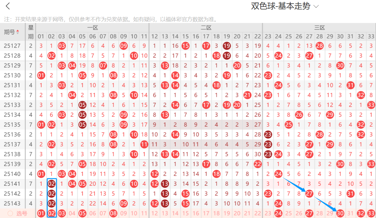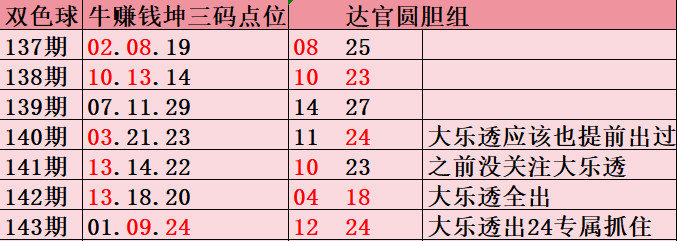 龙头凤尾:上期的分析我认为是非常精彩的,一码按死龙头2,锁定二路号偶数,直接抓住了2,直播间给大家三出点位击中9.24,这个24是142期双色球开完奖看的下期金胆,提前出了大乐透,昨天又出了双色球,条件是五六位同路号,看一路其次二路,给大家组合了一组0路收尾的,可惜没主看,胆尾2尾3尾5全部正确,我发现近期胆尾不看好的特别喜欢出,所以每期都会提醒,神奇的是每期都正确,会不会是我不看的也代表大多数人不看呢,比如上期胆尾5尾最不看好的是15果然开出了,预判重号多开正确,是不是还有一个号没提到看看下面这个图,这是最新研发的新数据,之前是每期讲没有表格化,下期开始每期都有。