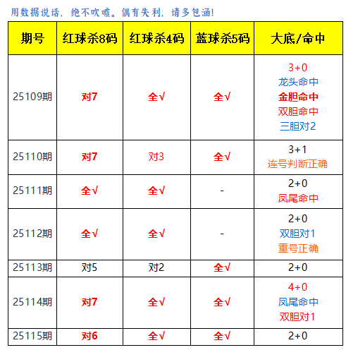 上期红球杀8码对7,免费文章杀4码对3,蓝球杀5码全对,目前连续4次蓝球杀号全对。