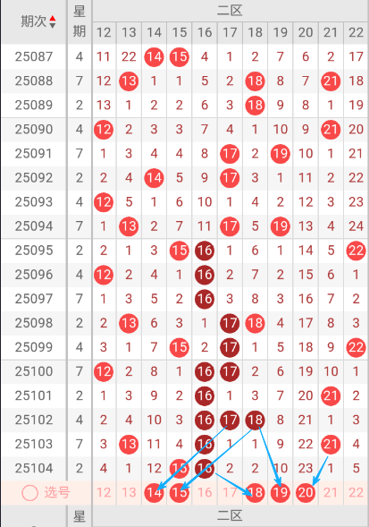 根据走势图可以看出当前区段,095期开出了15.16.22一个号码球,096期开出了12.16二个号码球,097期开出了16一个号码球,098期开出了13.17.18三个号码球,099期开出15.17.22三个号码球,100期开出了12.16.17三个号码球,101期开出了16.21二个号码球,102期开出了16.17.18三个号码球,103期开出13.16.21三个号码球, 104期开出了15.16二个号码球,按照如此规律本期当前区可能开出1单1双。我们看下当前区上期开出16重叠号,那么本期当前区要定重叠号的情况下可关注15号码球。再看下当前区上期开出15斜连号,当期选号得留意斜连14号码球。本区重点关注14.15.18.19.20