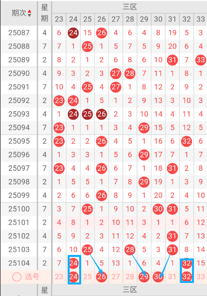 根据走势图可以看出当前区,095期开出来23.26.32三个号码球,096期开出了29一个号码球,097期开出了23.26.31三个号码球,098期开出29一个号码球 ,099期开出26一个号码球 ,100期开出了25.30.31三个号码球,101期没有开出号码球,102期开出了31一个号码球,103期开出了25.28.31三个号码球,104期开出了24.32二个号码球,按照如此规律判断本期当前区可能开出2双或1双。我们看下当前区上期没有开出重叠号,那么本期当前区要定重叠号的情况下可关注32码球。再看下当前区上期开出32斜连号,当期选号得留意23斜连号。本区重点关注24.26.29.30.32