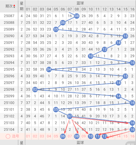 根据走势图近10期的走势看,蓝球在094期开出16蓝球之后,1小2大1小2大1小1大,再看下近10期的蓝球中冷码有回补的趋势,这种趋势规律本期判断极有可能开出小号,本期防蓝球13大号,蓝球本期重点关注06,08,10,11,12