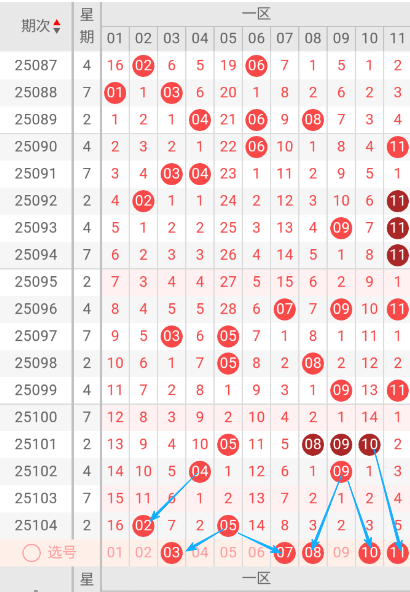 根据走势图可以看出当区段,095期没有开出码球,096期开出07.09.11三个号码球,097期开出了03.05一个号码球,098期开出了05.08二个号码球,099期开出09.11二个号码球,100期没有开出号码球,101期开出了05.08.09.10四个号码球, 102期开出了04.09二个号码球,103期没有开出码球,104期开出了02.05二个号码球,按照如此规律本期当前区可能会开出1单1双或2单。我们看下当前区上期没有开出重叠号,那么本期当前区要定重叠号的情况下可关注05号码球。再看下当前区段上期没有开出斜连号,当期选号得留意03斜连号。建议重点关注03.07.08.10.11