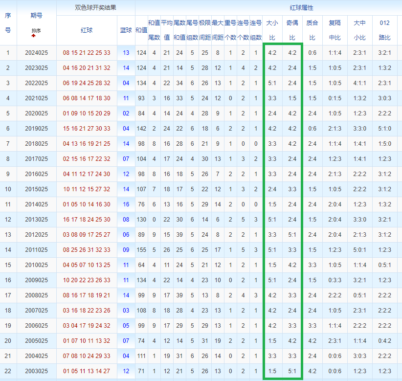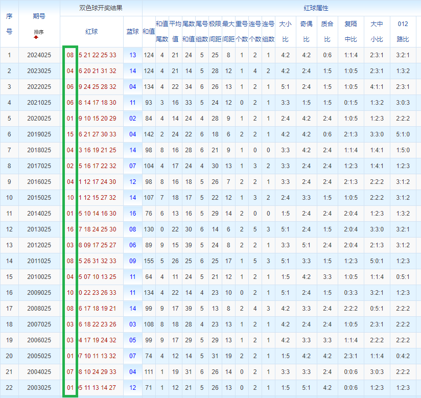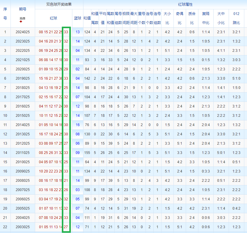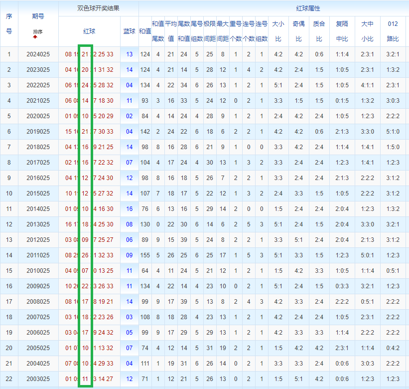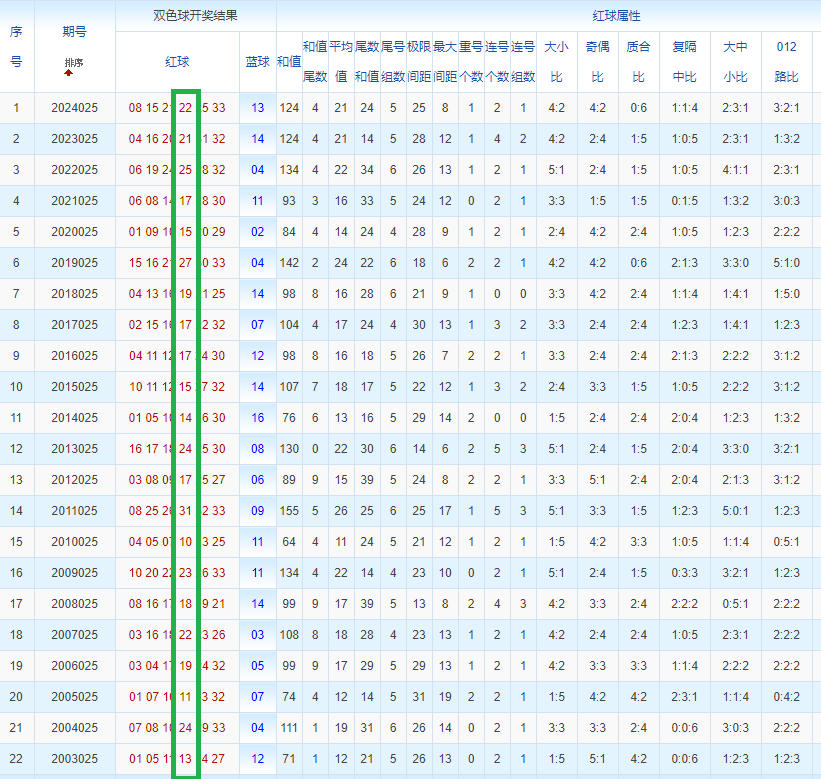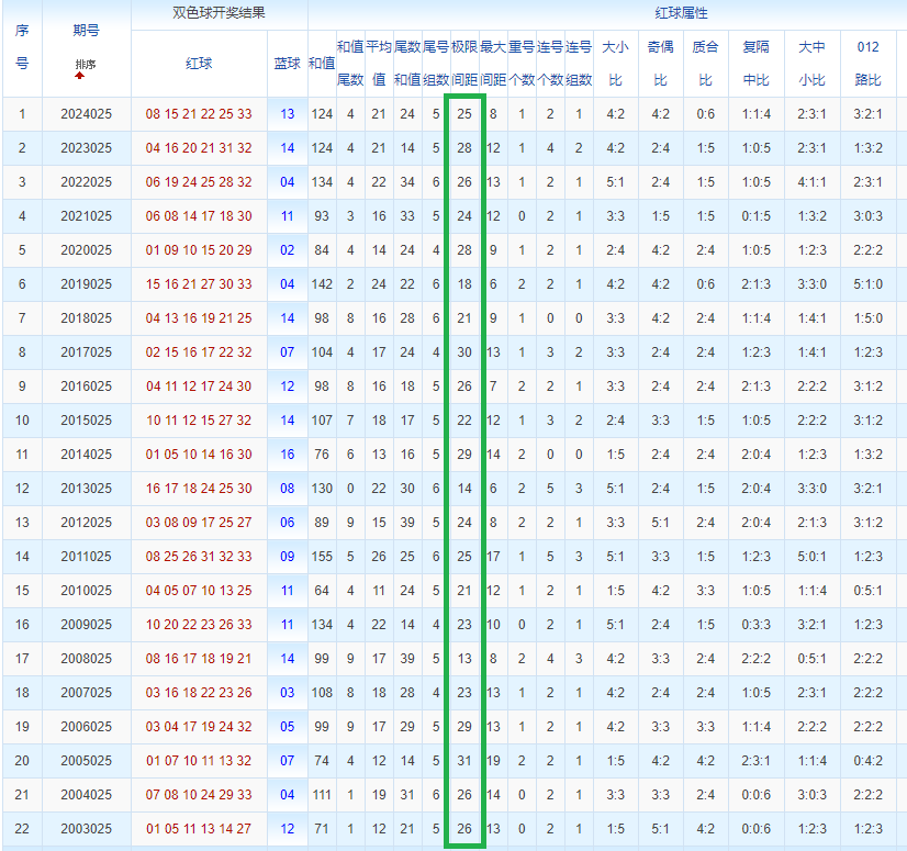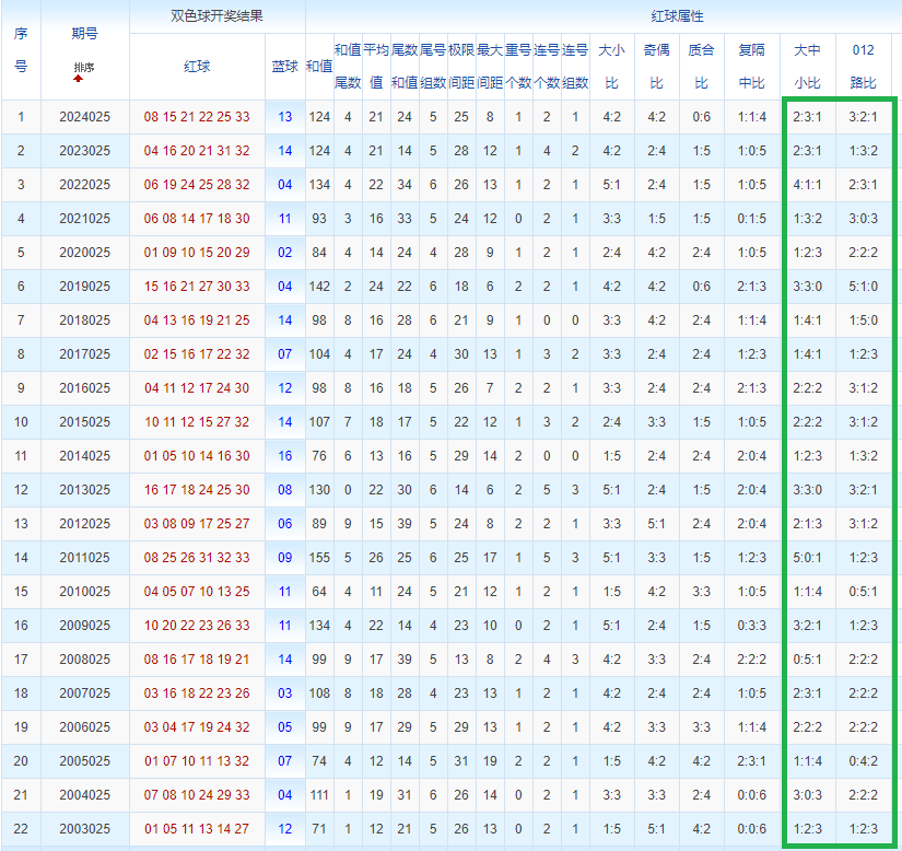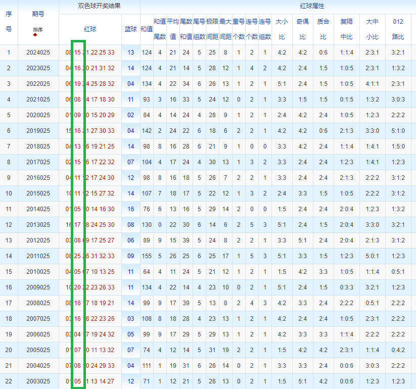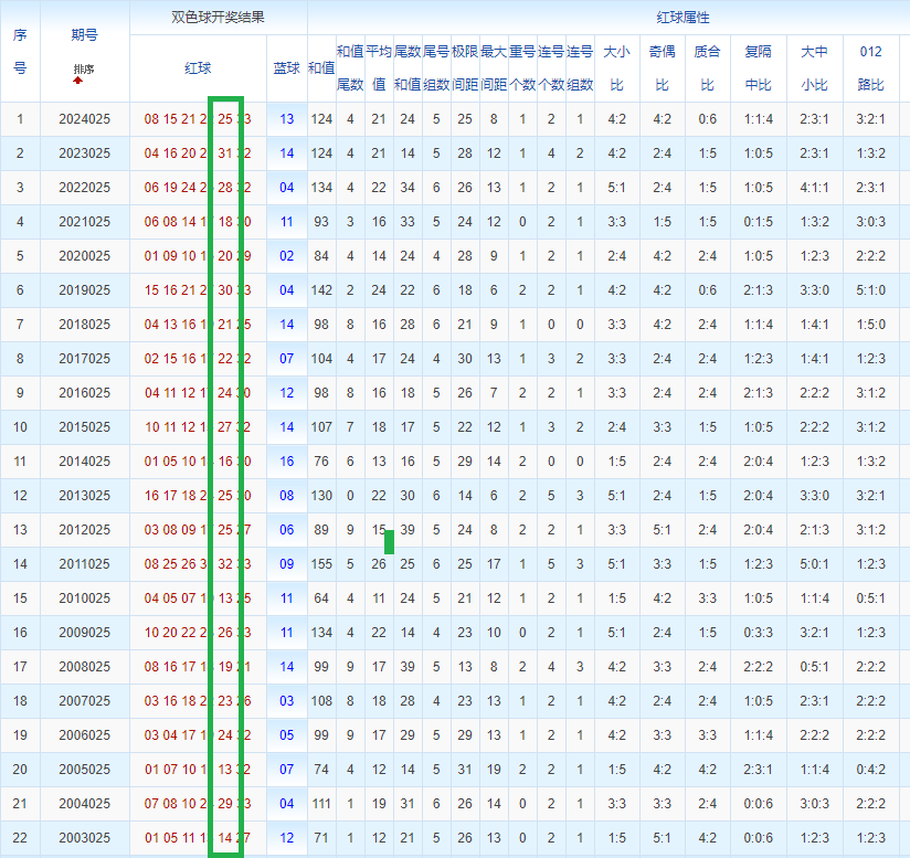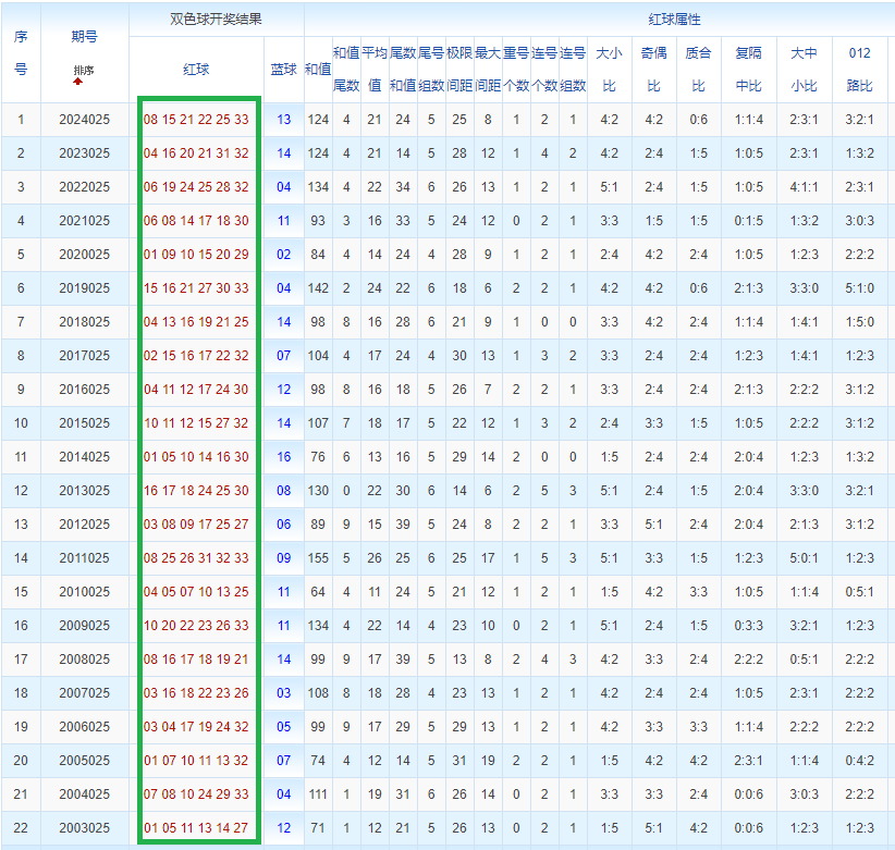 双色球玩法开奖多年,本人将从往年同期开奖号码和今年走势图来分析这期的开奖号数。比如研究2025025期,则把往年同期全部数据罗列出来分析,共22期。