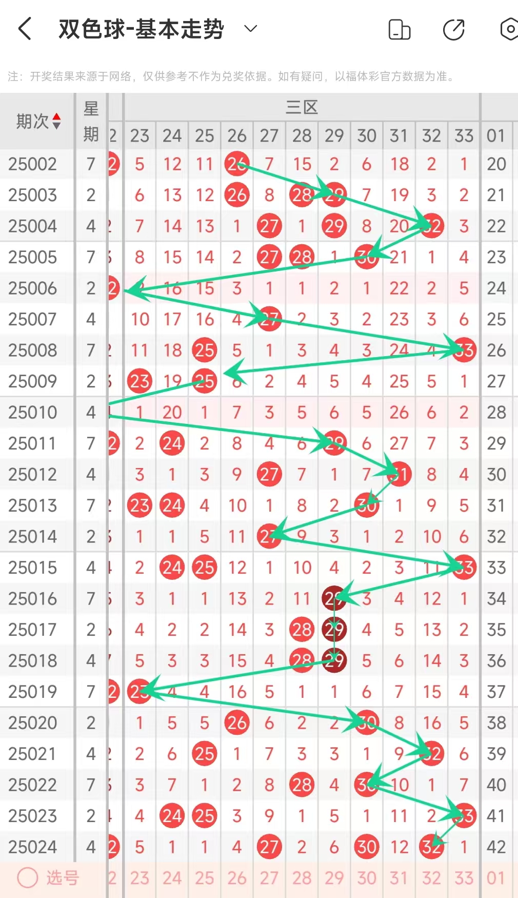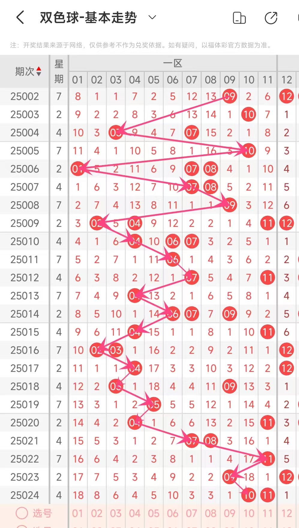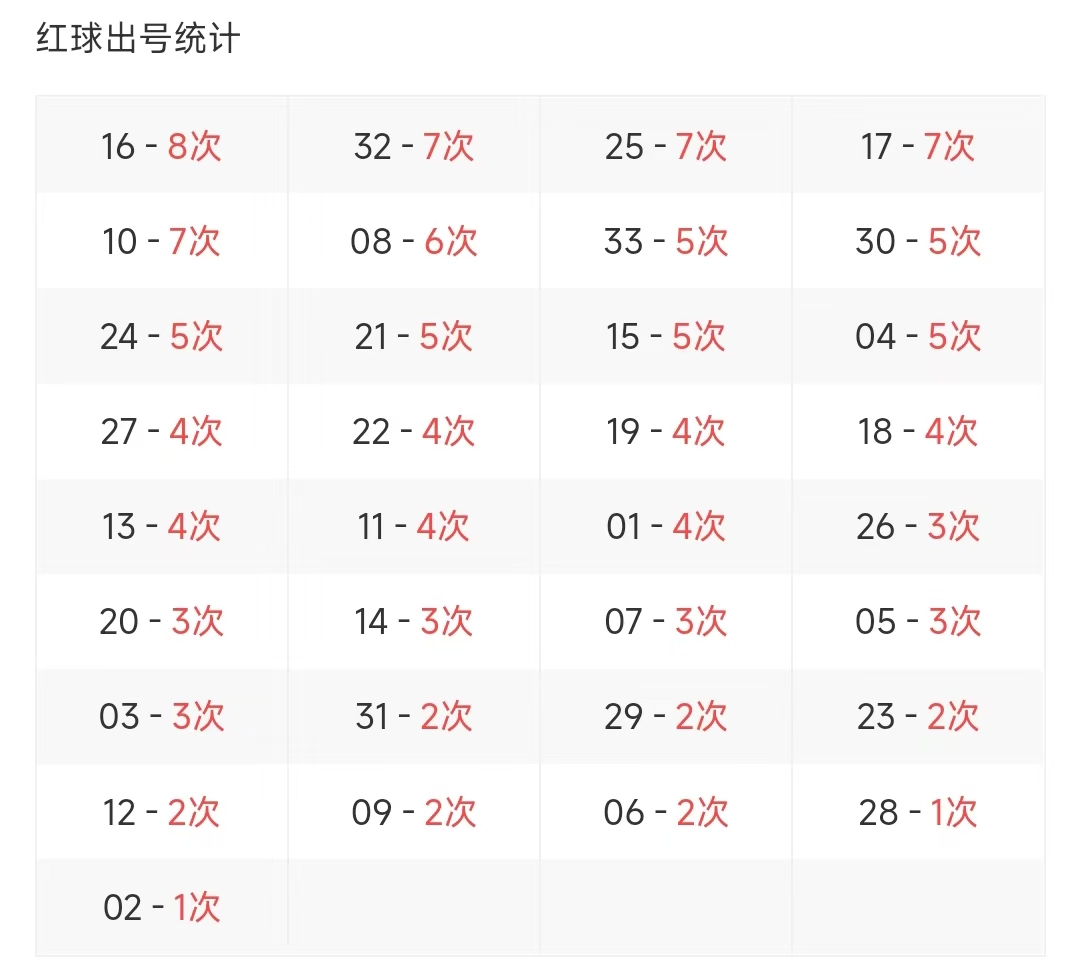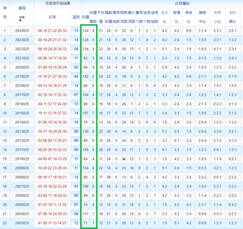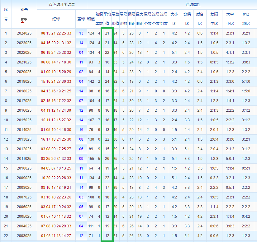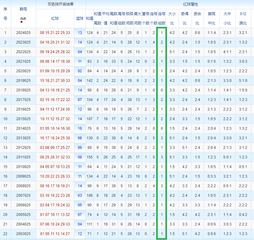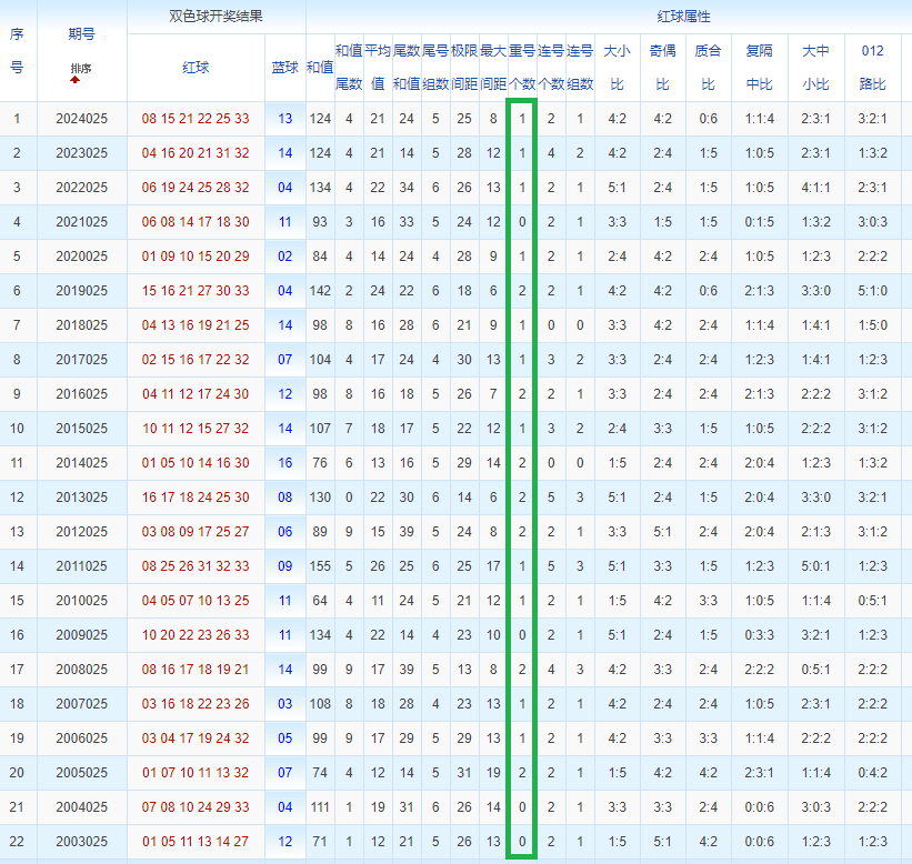 双色球玩法开奖多年,本人将从往年同期开奖号码和今年走势图来分析这期的开奖号数。比如研究2025025期,则把往年同期全部数据罗列出来分析,共22期。