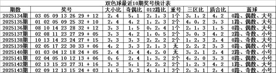 双色球第2025143期开出奖号为:02、09、12、13、15、24+03,其中红球号码奇偶比为3:3,大小比为1:5,012路比为4:1:1,和值为75,跨度为22,三区比为2:3:1,开出3个重复红球:02、13、15。蓝球开出奇数、小号、0路。