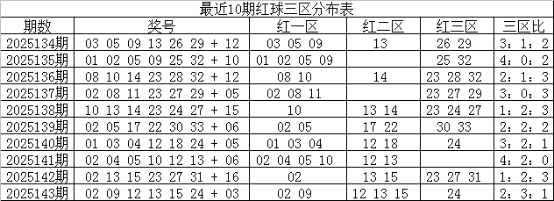 一区上期走温,出现2个奖号,近10期开出25个红球,表现非常活跃,本期看好继续大热,开出3个红球,参考号码01、05、11;二区上期表现较热,出现3个奖号,近10期共开出15个红球,走势相对较冷,本期注意回补,看好该区热出,关注3个红球,注意号码15、20、21;三区上期走温,开出1个红球,近10期共开出20个红球,出号与理论个数持平,本期注意转冷,防该区断区。