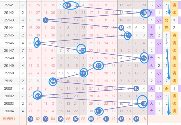 上图是福彩双色球红球号码走势图,我在上面画出来的蓝色小箭头都是遗漏周期小的数字,看上面蓝色小箭头,最近开出遗漏周期小的数字多,那么本期大家得关注那些遗漏周期大的数字,我在上面走势图中标注出来的数字16 20 23 25 27 29都是遗漏周期大的数字,关注这几个出2个或者3个吧。