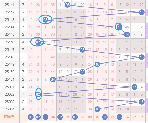 上图是福彩双色球蓝球开奖号码分布走势图,我在上面走势图中标注出来的数字都是质数,蓝球按照合数和质数分开,合数是04 06 08 09 10 12 14 15 16;质数是01 02 03 05 07 11 13,看上面蓝色圈圈表示的都是质数,最近开出的质数少,那么本期个人觉得大家得留意留意质数。