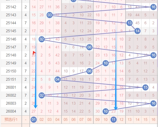 上图是福彩双色球蓝球开奖号码分布走势图,我在上面走势图中标注出来的蓝色箭头表示的就是蓝球1尾数的遗漏周期,其中蓝球01遗漏周期是27期,蓝球11遗漏周期是23,也就是说到第2026005期蓝球1尾数足足遗漏了23期,那么大家得多留意留意蓝球1尾数的数字。