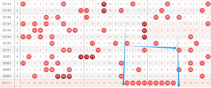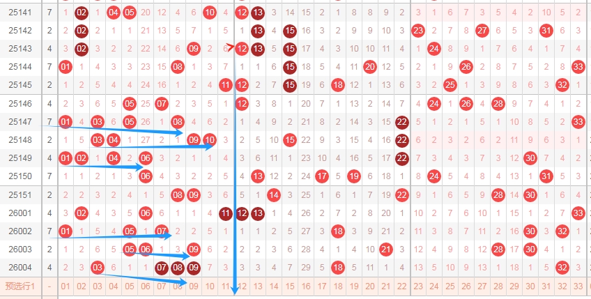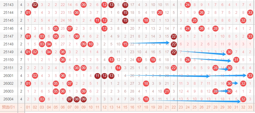 上图是福彩双色球红球号码走势图,我在上面画出来的蓝色箭头你们会发现,蓝色箭头左边最近出号码多,那么本期个人觉得这个区域号码可以关注出0个或者1个,最多关注出2个。蓝色箭头的右边可以关注出号码多一点。