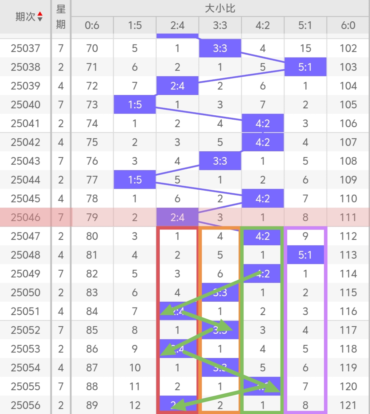 上期大小比是2:4,小数出号数量高于大数出号数量。近10期红球大小总比为32:28,大数出号数量高于小数出号数量。往期大小走势上一般大小比2:4开出后会开大小比2:4和大小比3:3,综合考虑,本期关注大小比2:4,防3∶3。3、红球奇偶比
