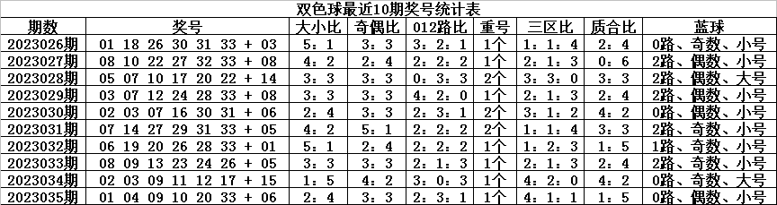 双色球第2023035期开出奖号为:01、04、09、10、20、33+06,其中红球号码奇偶比为3:3,大小比为2:4,012路比为2:3:1,和值为77,跨度为32,三区比为4:1:1,开出1个重复红球:09。蓝球开出偶数、小号、0路。