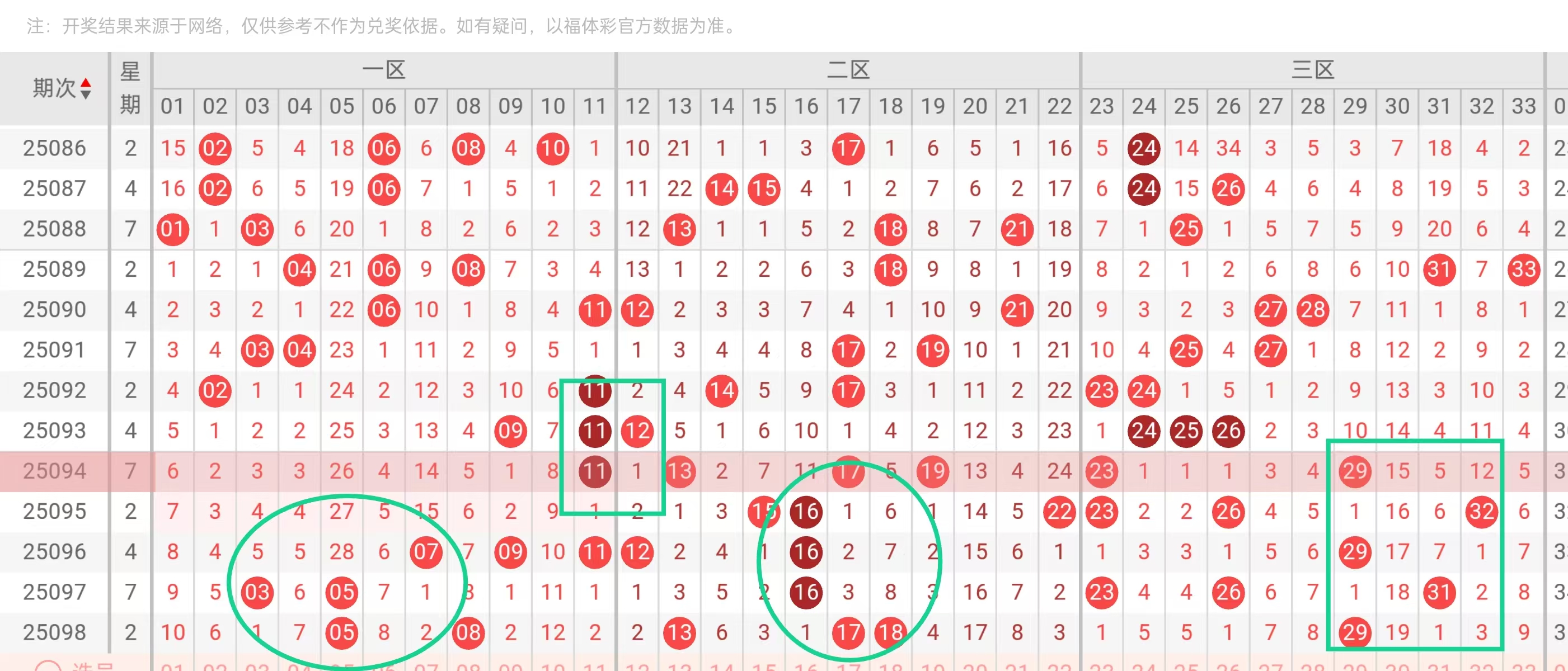 号码05、07、08、10、12、15、20、21、22、24、25、27、28、30、31、32、33:出现2次