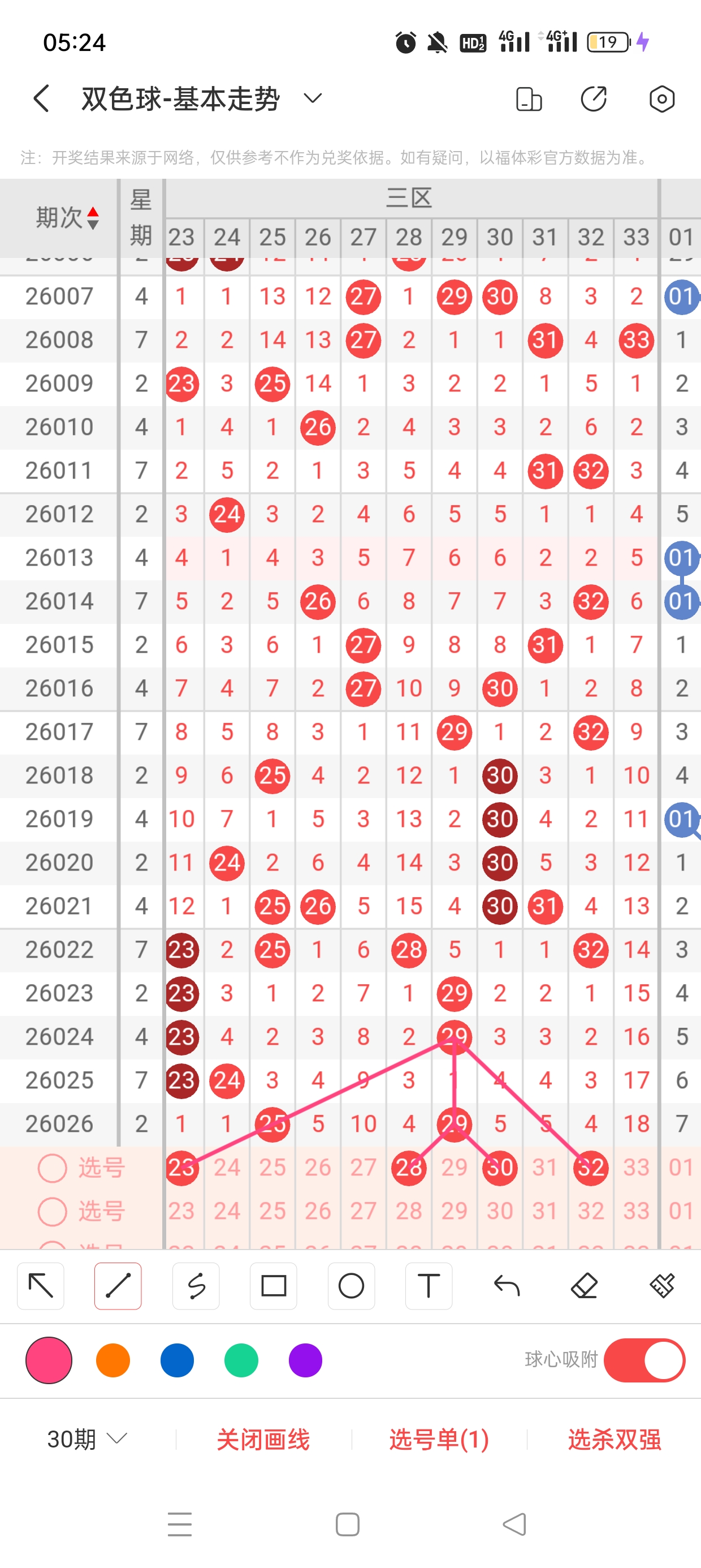 三区(23-33)近31期本区邻孤传6邻25孤0传,孤号热度高,本期着重邻传。近31期本区012路20:2:9,0/2路热度高,本着重1路。23已遗漏1期,与25之间呈现向左遗漏递减态势,需防。28、30分别遗漏4期、5期,两者依托29呈现正三角遗漏递减态势,需防。32已遗漏4期,与29之间呈现向右遗漏递减态势,需防。