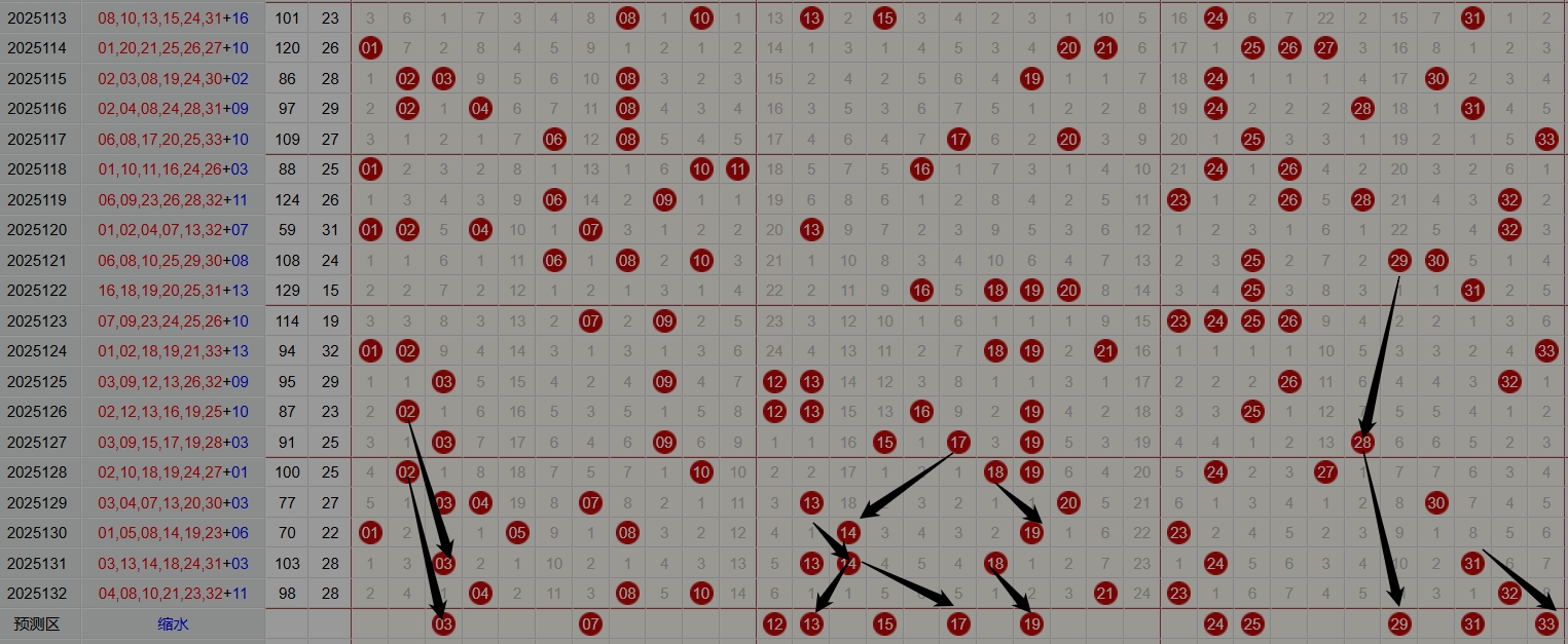 回顾上期25132期开奖04 08 10 21 23 32 + 11 ,其中一小区01-11出3个,二小区12-22出1个号,三小区23-33出2个!