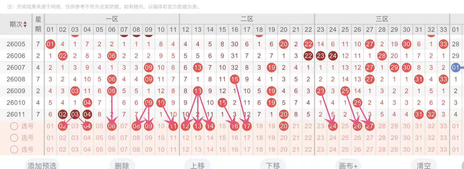 红球三区比:本期红球三区比为 3:1:2,近五期红球区间比分别为 1:2:3,2:1:3,2:2:2,3:2:1,3:1:2 本期预计红球三区比为 2:2:2。