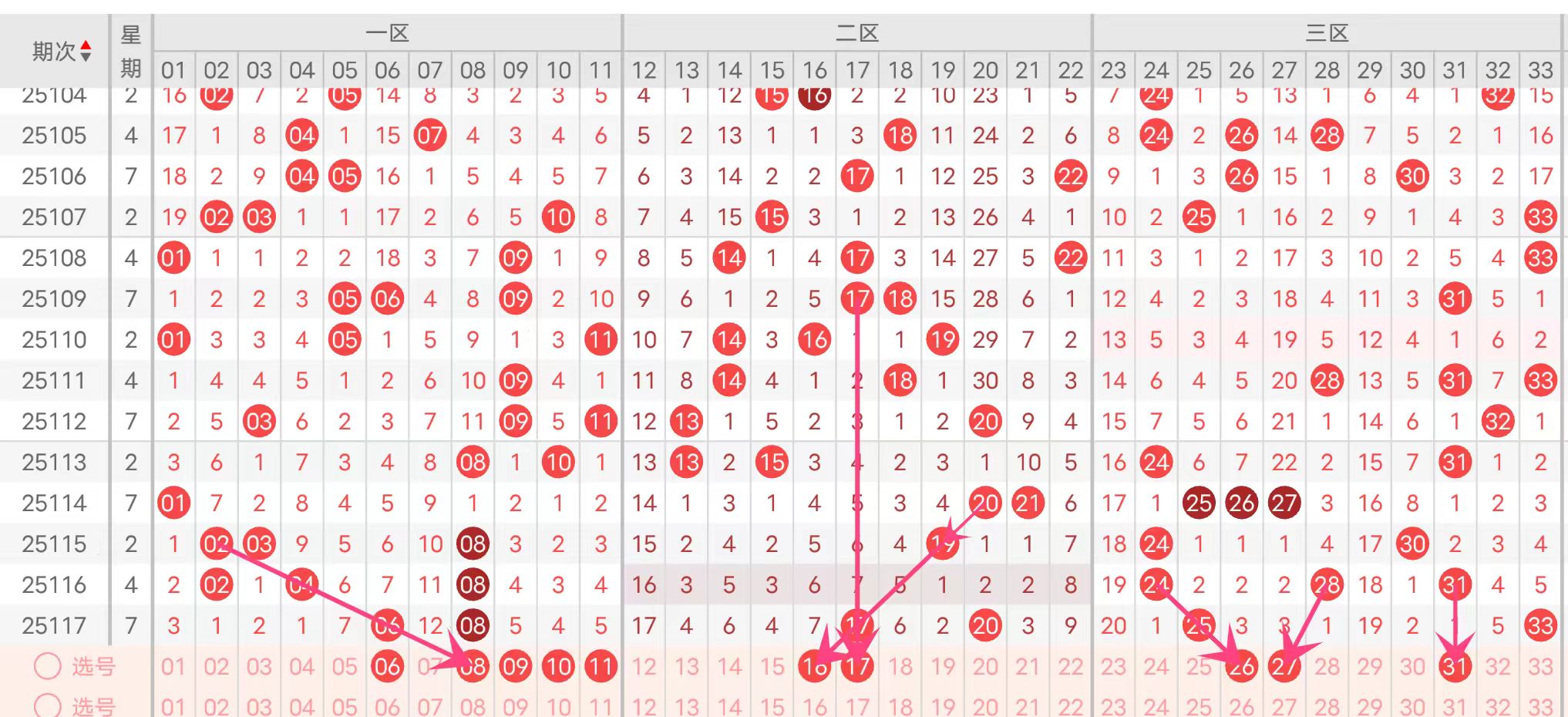 第一组:本期看中区出号,10至27出号多,蓝球03.05.09